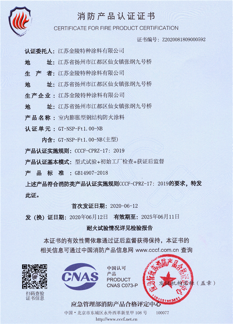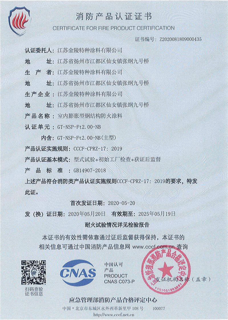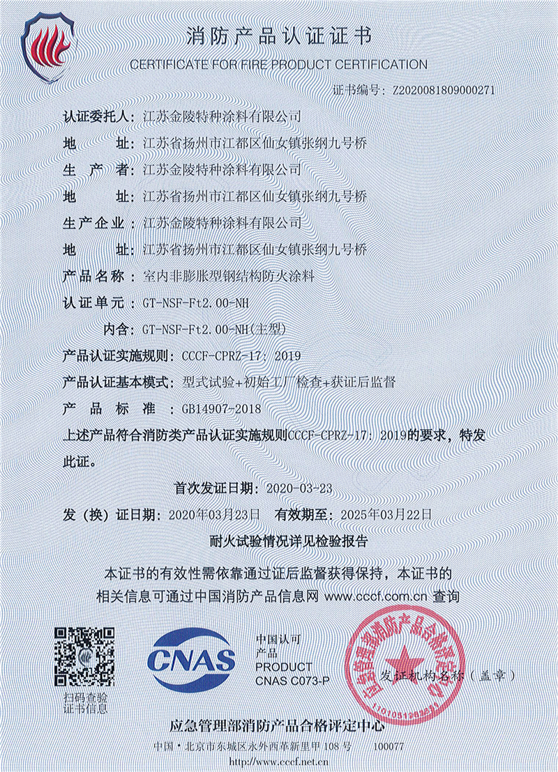 金陵非膨脹型防火涂料利用涂層固有的良好絕熱性,阻止火災(zāi)熱量向鋼材傳遞,并且在高溫下形成一種結(jié)構(gòu)致密的釉狀物,能有效隔絕氧氣并具有反射熱量作用,延緩鋼結(jié)構(gòu)溫升,起到防火保護作用。